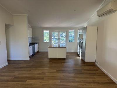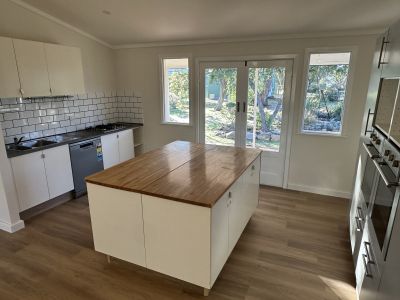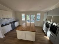 Large open plan Lounge/Kitchen with a modern new kitchen with huge bench space, double island bench, dishwasher, gas cooktop and 2 ovens.